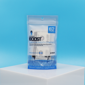 Use our 2-gram Integra Boost 2-way humidity control packs to control moisture in an enclosed area. Our patented technology will either release or absorb moisture, maintaining relative humidity at 62% in a contained environment. 2-gram Boost can be used with up to 7 grams of product